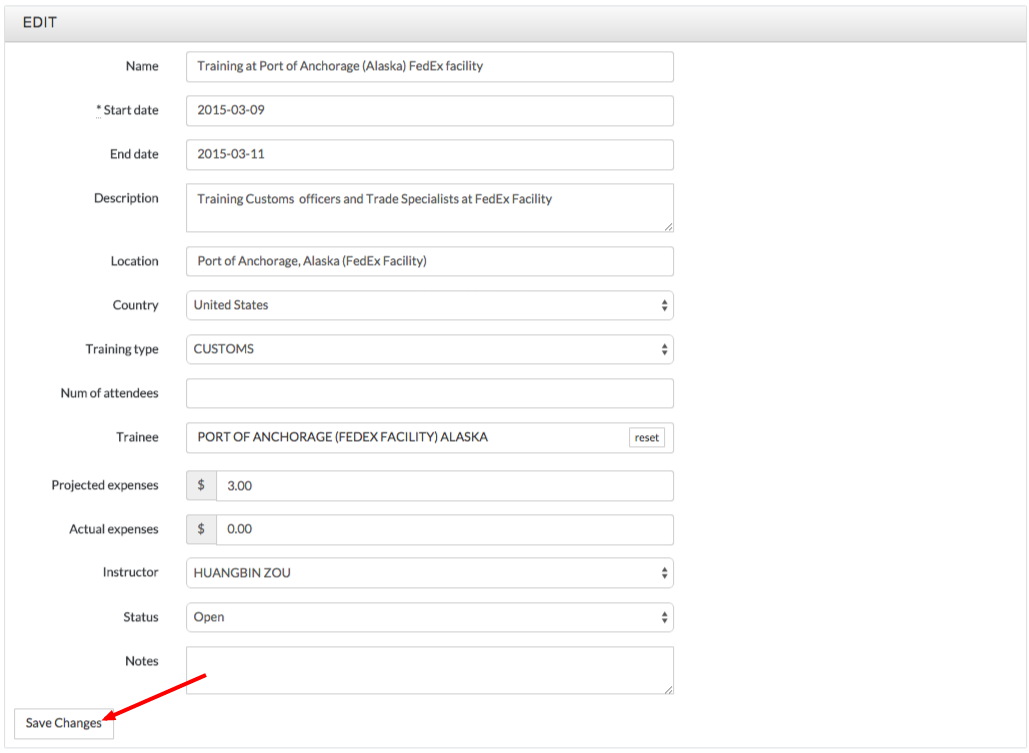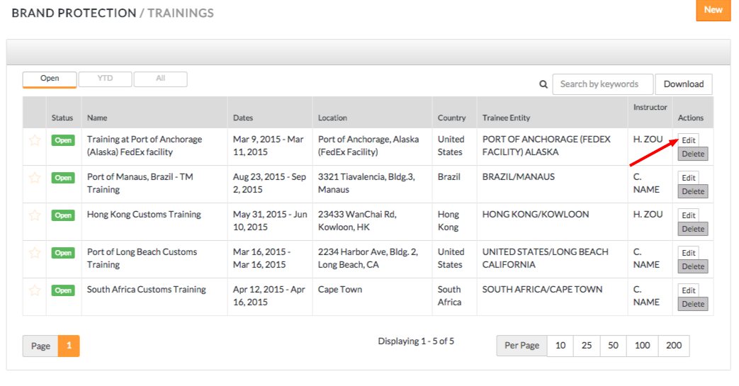 - To edit existing training records, click the Edit button to the right of the corresponding training