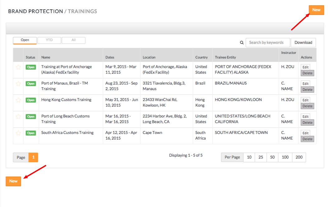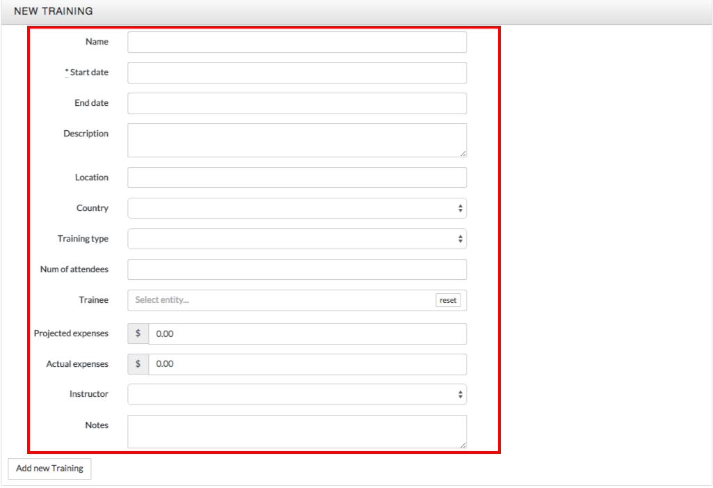 - Click the Add new Training button on the bottom left of the page to create a new training record