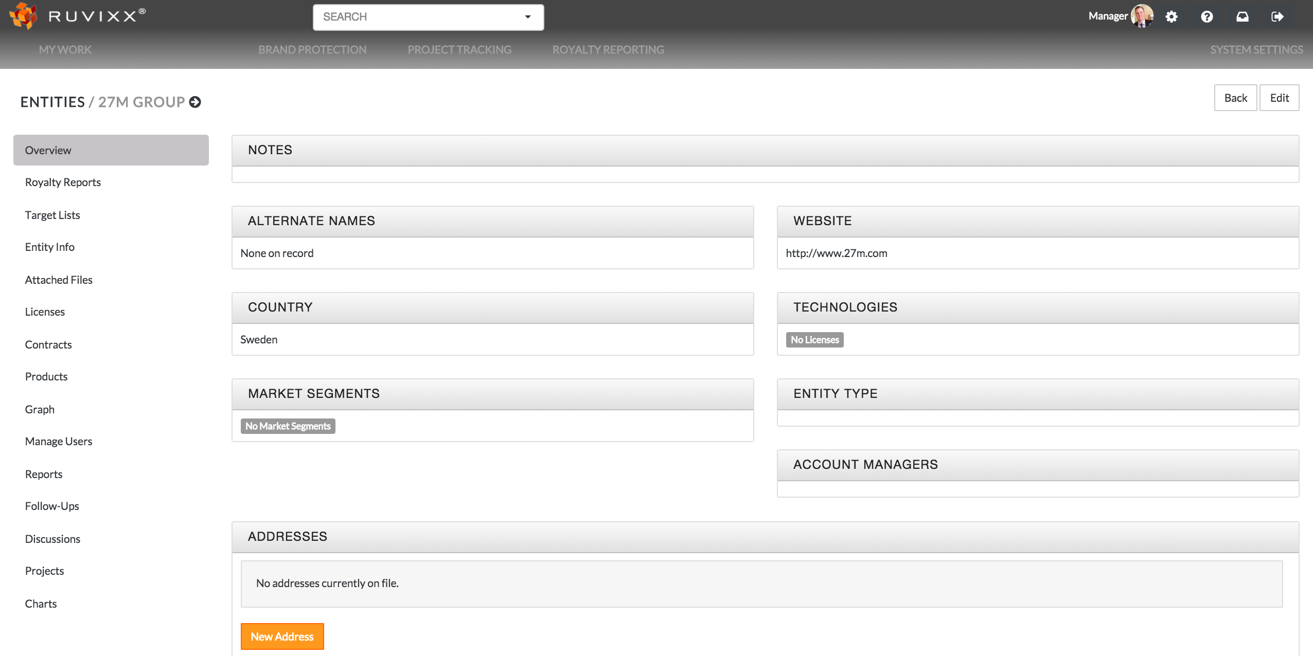 - Click on a specific entity to view and edit all entity related data